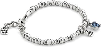 Sterling silver-plated bracelet with a bead and two charms; a blue faceted crystal and the iconic UNOde50 padlock.