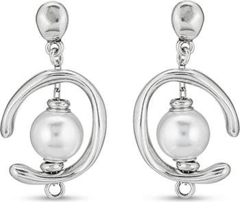 Sterling silver-plated hoop earrings with a white pearl in the center.