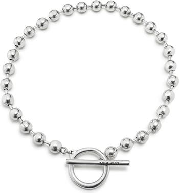 Midi sterling silver-plated necklace with multiple beads that culminate in a clasp formed by a circle with our engraved logo and a bar.
