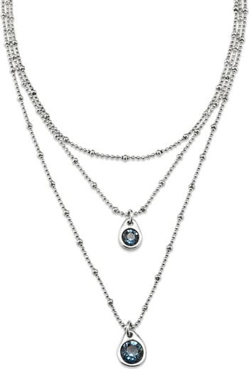 Three-strand sterling silver-plated necklace with two Indian Sapphire blue SWAROVSKI® crystals in the shape of a water drop.