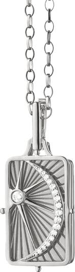 This sun, moon and stars locket in sterling silver with white sapphires is designed to hold what matters most—two of your cherished photos—close to your heart.