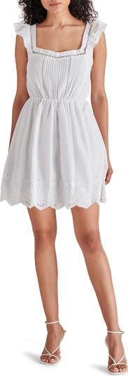 Cotton voile means comfort under the rays in this ruffle-strap mini sundress featuring embroidered insets and a scalloped eyelet hem.