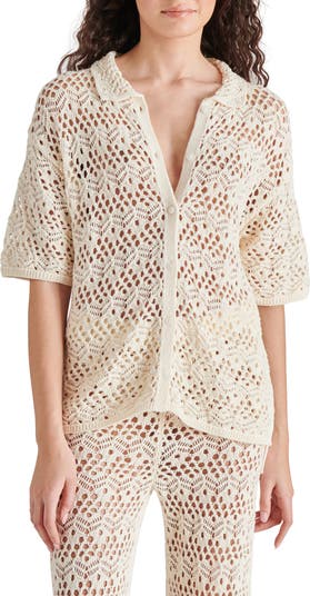 Love to layer in this airy crochet cardi knit with a polished collar and elbow-length sleeves.