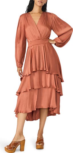 Smocking shapes the waist of this washed-satin midi dress that's ready for the dance floor with a fluttery tiered skirt that'll sway with each step.