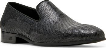 A glitter-encrusted upper creates luxe sophistication on an evening-ready loafer designed with a slender square toe for modern appeal.