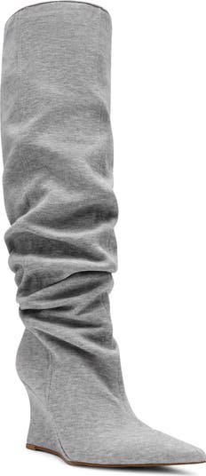 A slouchy knee-reaching silhouette brings streetwear cool appeal to this pointy toe boot perched on a distinctive wedge heel.