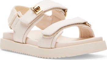 A playful pattern adds kid-approved charm to the adjustable straps of a slingback sandal set on a low, cushy platform.