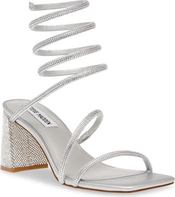 Faceted crystals cover this square-toe sandal that sends a single strap coiling up your ankle.