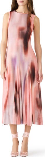 Exaggerated pleats highlight the flowy skirt of a carefree sleeveless dress in an artistic abstract print.