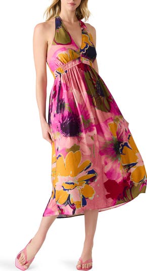 Vibrant blooms power the resort-ready vibe of this breezy halter-neck sundress framed by an elastic Empire waist and flared midi-length skirt.
