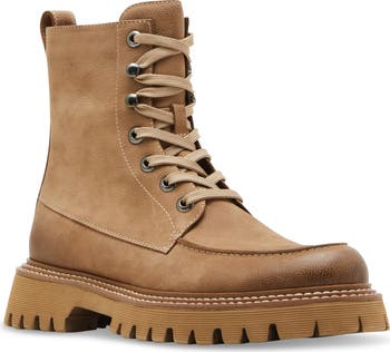A functional side zipper and lace-up design offer easy wear on a nubuck leather boot crafted with a bold moc toe and rugged lug sole.