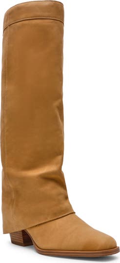A foldover shaft amplifies the rich dimension of a square-toe leather boot shaped in a knee-high profile and lifted by a chunky, stacked heel.