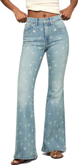 Channel the free-spirited styles of the '70s in these full-length flare jeans made from modern stretch denim and embroidered with drifting daisies.