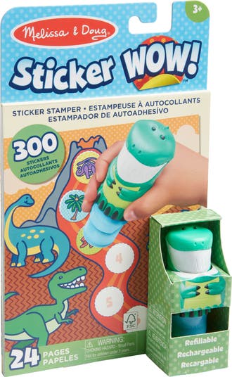 Adorable, collectible Olive the dinosaur stamp, stamp, stamps its way through fun-filled, fantasy-themed counting, matching and search-and-find activities. The refillable sticker stamper comes pre-loaded with a sticker stack of 300 assorted stickers with 100 unique designs in every stack. Stickers are not reusable, but are easy to remove if necessary. Fill in the activity pages and use for creative art projects, such as bookmarks, posters, cards and more. Easy-to-remove stickers and the convenient on-the-go format with built-in sticker stamper storage makes this a great mess-free travel activity. This kit promotes fine motor skills, encourages creative play and its satisfying, fidget fun.