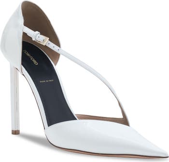 An iconic pin-thin heel exaggerates the lofty height of this patent leather pump crafted in Italy with a slim asymmetric strap and sculpted with a wicked pointy toe.