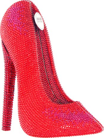 Take your accessory game to new heights with this stiletto pump-shaped clutch illuminated with fiery-hued sparkling crystals.