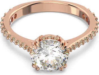 Double prong settings house a brilliant crystal surrounded by more pavé stones on the band and gallery for signature Swarovski shine.