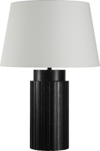 A stunning addition to contemporary interiors, this dimmable table lamp showcases a ribbed wooden base and a tapered, clean-lined drum shade.