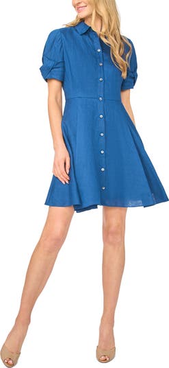 Artfully folded cuffs bring modern dimension to this breathable linen shirtdress fashioned in a charming fit-and-flare silhouette.