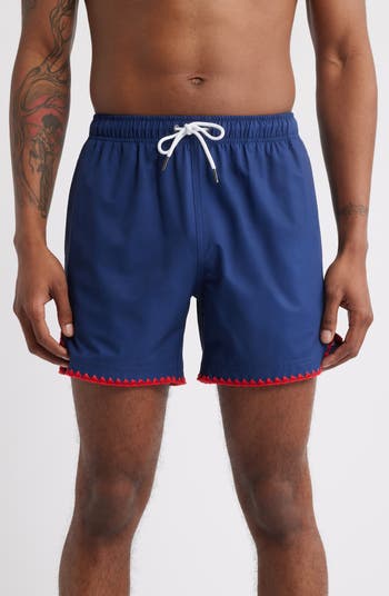 A stitched border adds retro-cool style to quick-drying, waterproof swim trunks made with recycled materials and comfy four-way stretch.