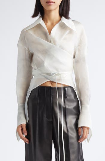 Slinky ties transform this hazy silk-organza button-up into a body-hugging wrap design, as showcased on the runway for Grace Ling's 'Neanderthal' collection. Sculptural metal bars—Ling's signature—stand in for buttons along the front placket and angular cuffs.