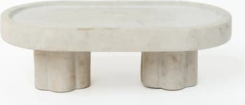 An elongated low profile candle holder rendered in smooth marble inspired by roman columns are a sleek, structural statement and lend a touch of warm light.