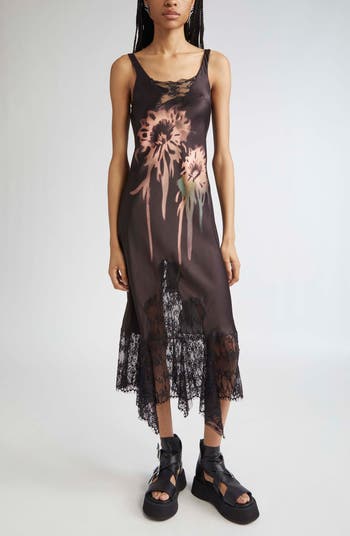 The runway-featured 'Flower Drip' graphic amplifies the dreamy romance of this bias-cut satin slipdress that's finished with a swingy handkerchief hem and abstract panels of floral lace.
