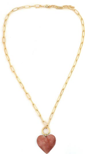 A romantic semiprecious stone heart pendant sweetens this polished paper-clip chain necklace plated in warm 14-karat gold.