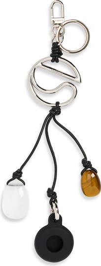 This functional key chain features polished stones suspended alongside a discreet circular holder designed to store an Air Tag. Finished with knotted leather cords and metal logo hardware, it offers a way to keep track of everyday essentials.