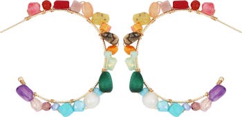 A color-filled collection of stones, crystals and cultured pearls update classic 14-karat gold-plated hoops.