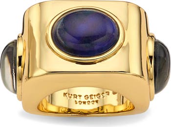 Resin cabochon-cut stones in a variety of colors add to the moody vibe of a statement-making cocktail ring fashioned in a dynamic geometric setting.