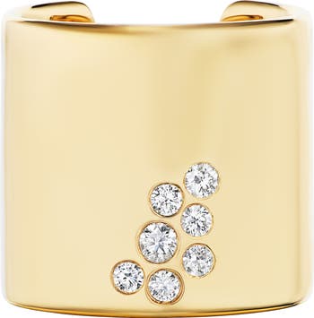 A cluster of round diamonds catches the light atop this gleaming 18-carat gold cuff ring made with a statement-making wide band.