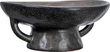 Indulge in the boho-inspired charm of this stoneware bowl, featuring a stunning black reactive glaze that adds depth and character to its organically-shaped silhouette. This serving bowl is a true work of art, with a sculptural base and handle that will elevate any dining space. Crafted from 100% stoneware, this bowl is as durable as it is beautiful, ensuring that it will last for years to come. The natural variation of the reactive glaze creates a unique and captivating finish that is completely one-of-a-kind. Whether displayed alone as a standalone accent piece atop a console table, or filled with your favorite dried botanicals, this bowl is perfect for adding a touch of artisanal charm to any interior design scheme. Its food safe design also makes it a unique serving dish that is sure to impress guests at a dinner party.