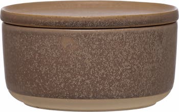 Brown stoneware bowl with lid in a reactive glaze; Beautifully corral small everyday items, or decoratively display dried botanicals in this striking accent bowl; Made from 100% stoneware; Bowl measures 6" L x 6" W x 3" H