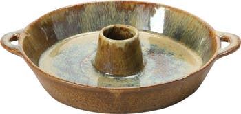 This dish is perfect for serving foods to friends or family. With a toothpick holder in the center, this dish is perfect for serving small appetizers and finger foods at your next gathering. Features a beautiful brown reactive glaze