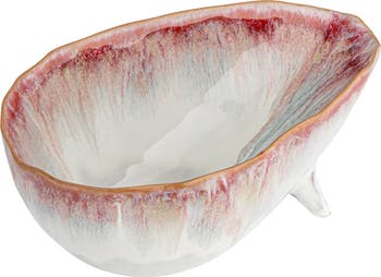 This Berry Stoneware Footed Bowl exudes a delicate charm, with its organic form and soothing color palette of white and berry achieved through a reactive glaze. Each bowl is unique, with subtle variations in the finish that add to its allure. The dimensions of 6.50 inches in length, 4.00 inches in width, and 2.75 inches in height make it an ideal choice for presenting small dishes or enhancing the home with its understated beauty. Whether used for dining or as a part of every interior design, this bowl's food-safe quality and enchanting appearance make it a versatile and treasured addition to any collection.