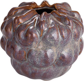 - A stunning and unique stoneware vase that has a formed shape and a reactive glaze in blue and brown colors