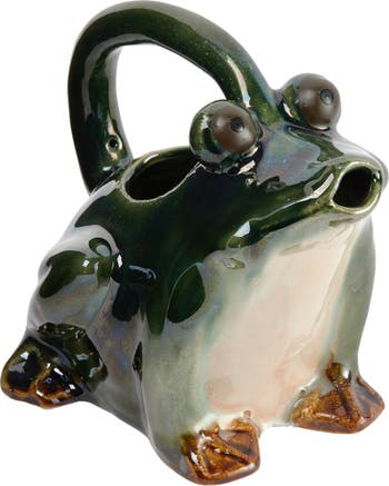 - This whimsical stoneware watering pitcher features the silhouette of a frog with an integrated handle in a naturally variating reactive glaze