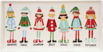 - A festive stoneware platter featuring a charming print of Santa's elves in vibrant multicolor