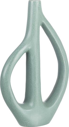 This green stoneware sculptural vase is a beautiful and unique addition to any home décor. The simple, cylindrical shape of the vase is both elegant and understated, making it a versatile addition to any home decor. The muted green color is both calming and sophisticated, and it would look great in a variety of styles, from traditional to modern. The teardrop handles add a touch of elegance and sophistication to the vase. They are made of the same green ceramic as the vase and are shaped like teardrops, which gives them a graceful and delicate appearance. The handles also make the vase easy to grip and move, which is helpful when filling or cleaning it. The vase measures 9.5 inches long, 3 inches wide, and 14.75 inches tall. This size makes it a perfect centerpiece for a dining table or coffee table. It would also look great on a shelf or mantle. This green stoneware sculptural vase is versatile, elegant, and functional, making it a perfect choice for any home.