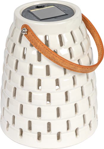 Illuminate the outdoor space with this stoneware solar lantern with a charming and versatile design. This lantern showcases a 6.5-inch round stoneware base with a white color and a textured surface that creates a natural and cozy look. The base is adorned with unique cut-outs that make mesmerizing patterns when the LED light shines through, adding a touch of enchantment to any surroundings. The lantern also has a brown faux leather handle that adds a touch of contrast and convenience; hang it or carry it easily. The lantern is suitable for any outdoor areas that need charm and elegance, such as gardens, patios, and porches, where it can create a warm and inviting ambiance. The lantern is also energy-efficient, using LED lights powered by a rechargeable solar battery. An 8-hour charge time harnesses the sun's energy during the day to provide up to 5 hours of continuous illumination at night. For quality and durability, the lantern is made of stoneware, solar panels, and faux leather. It measures 6.5 inches in diameter and 8 inches in height. Add this stoneware solar lantern to the home and enjoy its beauty and functionality.