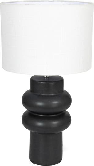 - A modern and sleek table lamp with a black stoneware base and a white linen shade