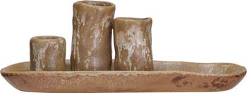 - A lovely set of two stoneware vases and a candle holder that come with a matching tray, all in a brown color and a reactive glaze finish