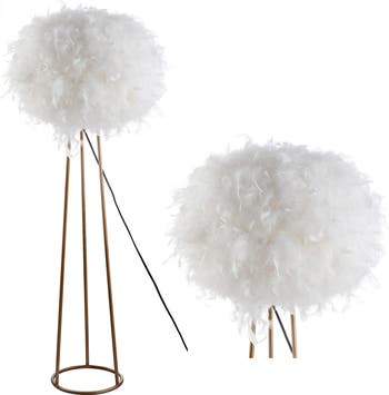 Light as air, this chic floor lamp is charming and contemporary adorned in white feathers. With a single bulb and brass base, the scene-stealing feather dome softens the light while retaining a contemporary aesthetic that blends well with any style of decor. And at only 52" high, its small scale is well-suited for any floor or room.