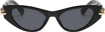 Angular cat-eye frames and hardware-accented temples distinguish polycarbonate sunglasses fitted with polarized lenses for glare reduction and superior clarity.