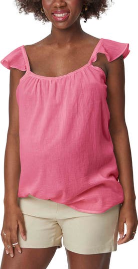 Frilly ruffles adorn the shoulders of a maternity tank top cut from lightweight cotton that will keep you and your bump cool on warmer days.