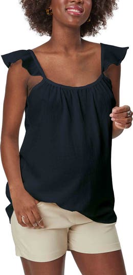 Frilly ruffles adorn the shoulders of a maternity tank top cut from lightweight cotton that will keep you and your bump cool on warmer days.