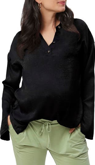 A billowy silhouette and flared sleeves define a satiny-smooth maternity top with a button half-placket neckline.