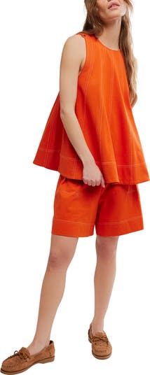 Contrasting, top-stitched seams bring visual depth to this coordinating set featuring a swing top with dropped armholes and matching pull-on shorts.
