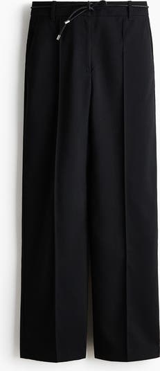 Trousers in woven fabric featuring a high waist with a narrow, braided tie belt, a zip fly and concealed hook-and-bar fastening. Discreet side pockets, fake jetted pockets at the back and straight legs with sewn-in creases down the front and pressed creases down the back.